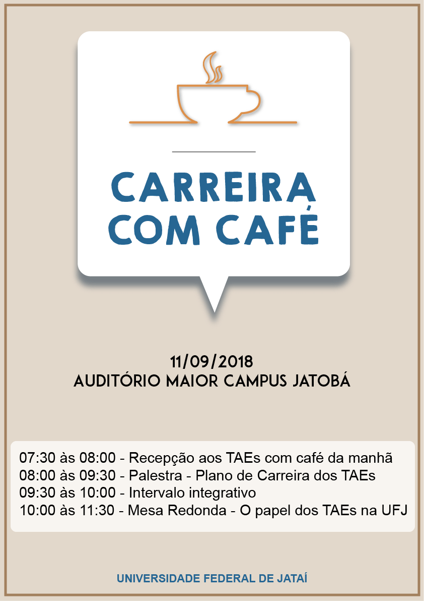 Carreira com Café Evento Local: Auditório Maior - Câmpus Jatobá da UFJ Data do Evento : 11 de Setembro 2018 - 8h às 12h Listar Todas Voltar